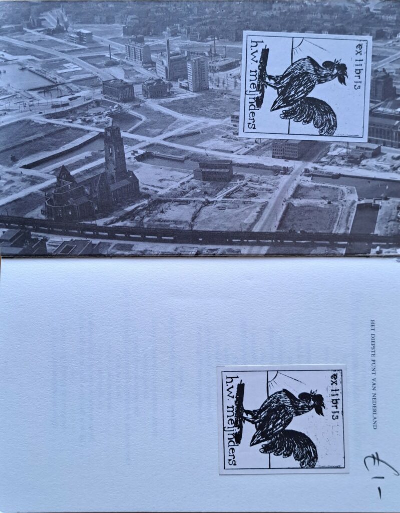 Of H.W. Meijnders deze periode ook zo heeft ervaren, weten we natuurlijk niet. Maar het zou kunnen, want een klein onderzoek leert dat ook hij vóór de Tweede Wereldoorlog is geboren, twee jaar na Hofland, de auteur van het boek. Hij moet dus vergelijkbare herinneringen hebben gehad aan het bombardement en het puin. Ik ga er daarom maar vanuit dat dát de reden was dat Meijnders dit boek ooit heeft gekocht en er zelfs twee ex librissen in plakte.