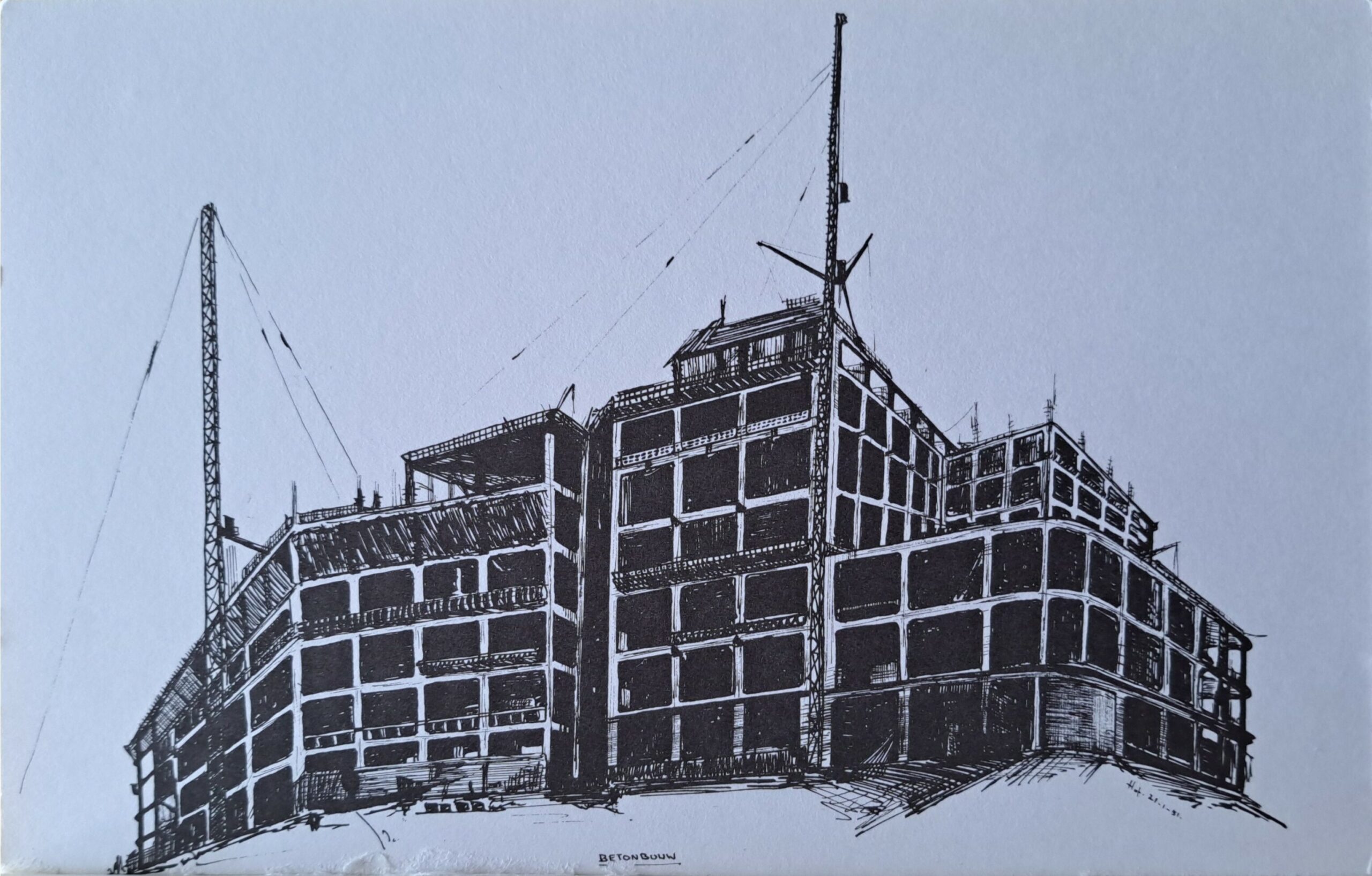 Schets van H.J.A. Hofland van het Groothandelsgebouw in aanbouw